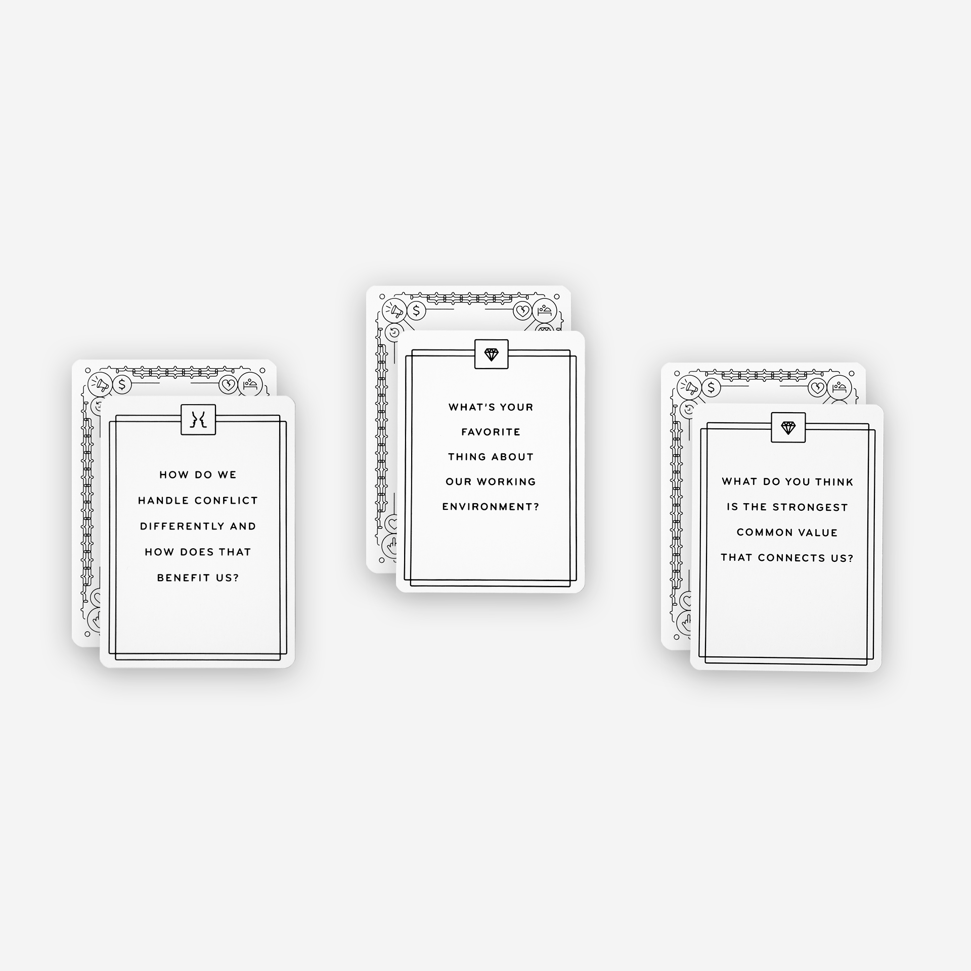 Build your team's collaborative culture. Foster a culture of openness, trust, and inclusivity on your team, one engaging conversation at a time. Discover surprising commonalities and differences that enhance teamwork, and spark new ideas and solutions in lively discussions.