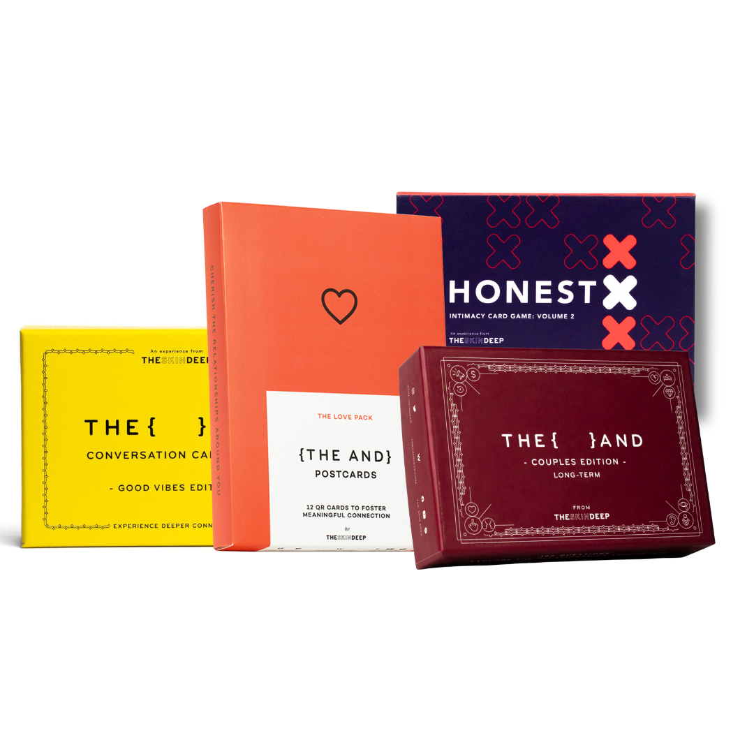 From cozy date nights at home to relationship check-ins and adventurous new explorations, this bundle provides everything you need to cultivate deeper understanding, stronger communication, and more intentional connection. Based on The Skin Deep's Emmy Award-winning documentary and viral videos, these tools help you build the relationship you've always dreamed of—one conversation at a time.
